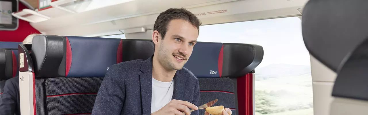 - a free catering offer, adapted to the time of day (depending on the train departure time: breakfast until 8.45am, sweet or savoury snack from 8.45am to 10.50am and from 1.45pm to 6.45pm, lunch from 10.50am to 1.45pm and dinner from 6.45pm), served at the seat only in the OPTIMUM PLUS area. The catering service is not provided in the event of an exchange on a full train without a designated seat or on an OUIGO train as part of the exchange facility on the day of departure.